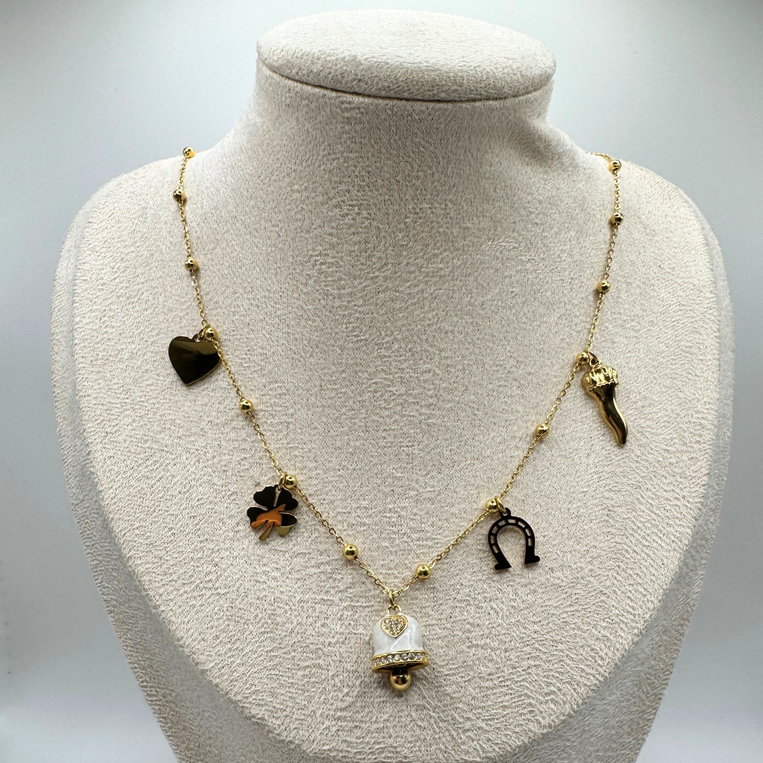 La collana Fortuna è composta da delicati ciondoli che custodiscono significati preziosi: la campanella di Capri, simbolo di protezione, il ferro di cavallo, portatore di buona sorte, il corno scaccia sfortuna, il cuore come amuleto d’amore e il quadrifoglio, emblema di fortuna rara.
